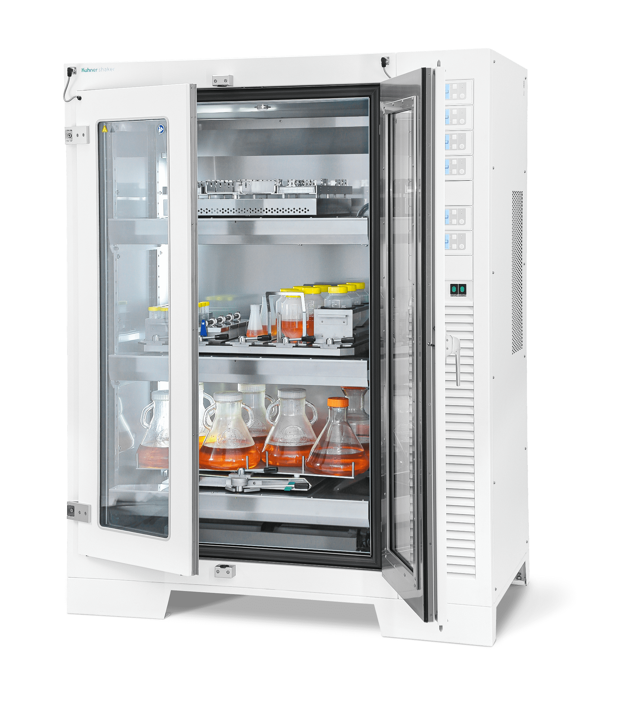 The Kuhner ISF4-X incubator shaker offers large shaking capacity and is available with temperature, humidity and CO2 control. The shaker cabinet can incorporate up to five independent shaking units. The shaking diameter and speed of each unit can be individually selected. Standard diameters are 12.5, 25 and 50 mm; other diameters are possible. The large doors allow easy access to the shake flasks inside and are fitted with a safety switch to ensure shaking stops when the doors are opened. The interior chamber is made of stainless steel making sterilization with chemicals possible.
