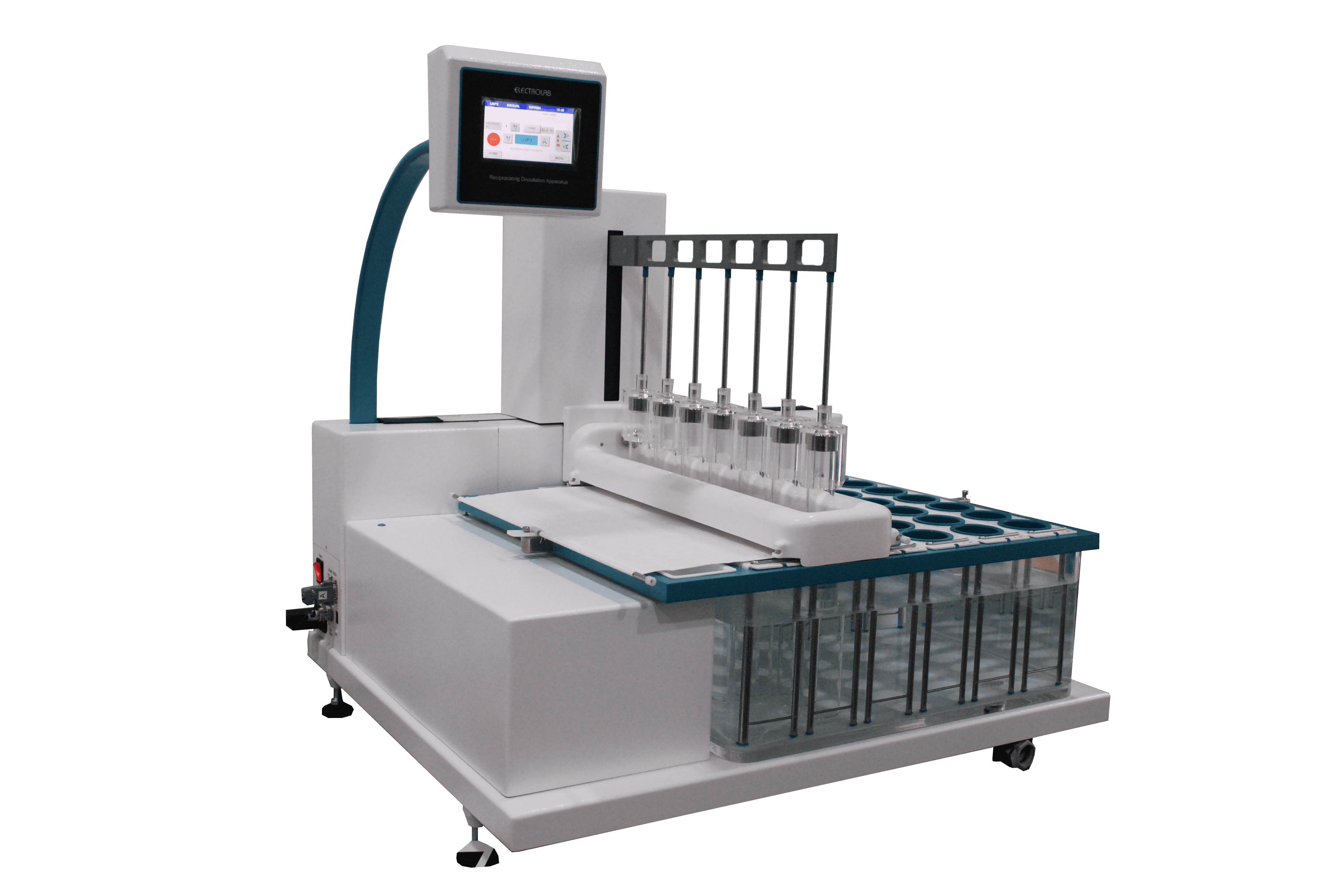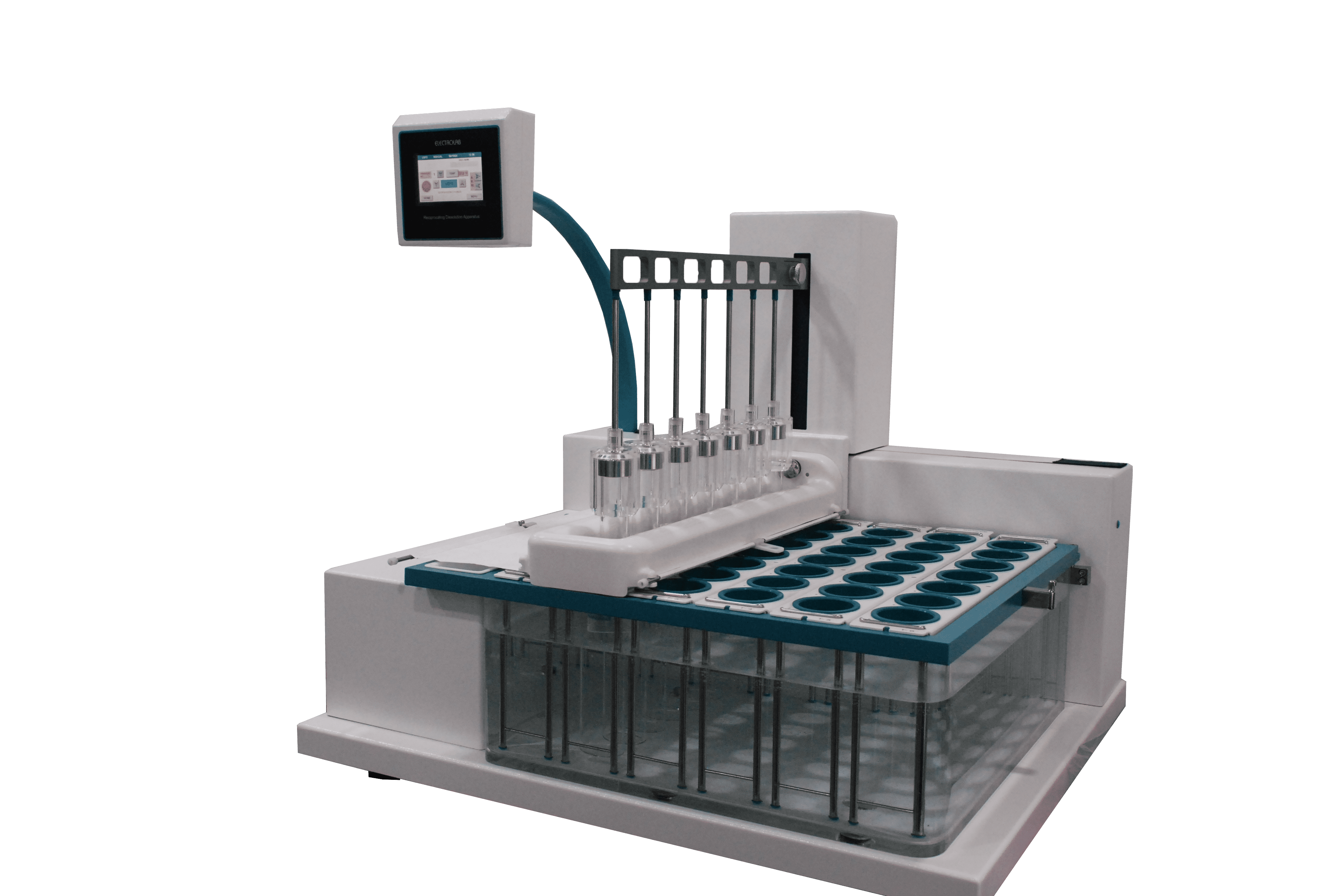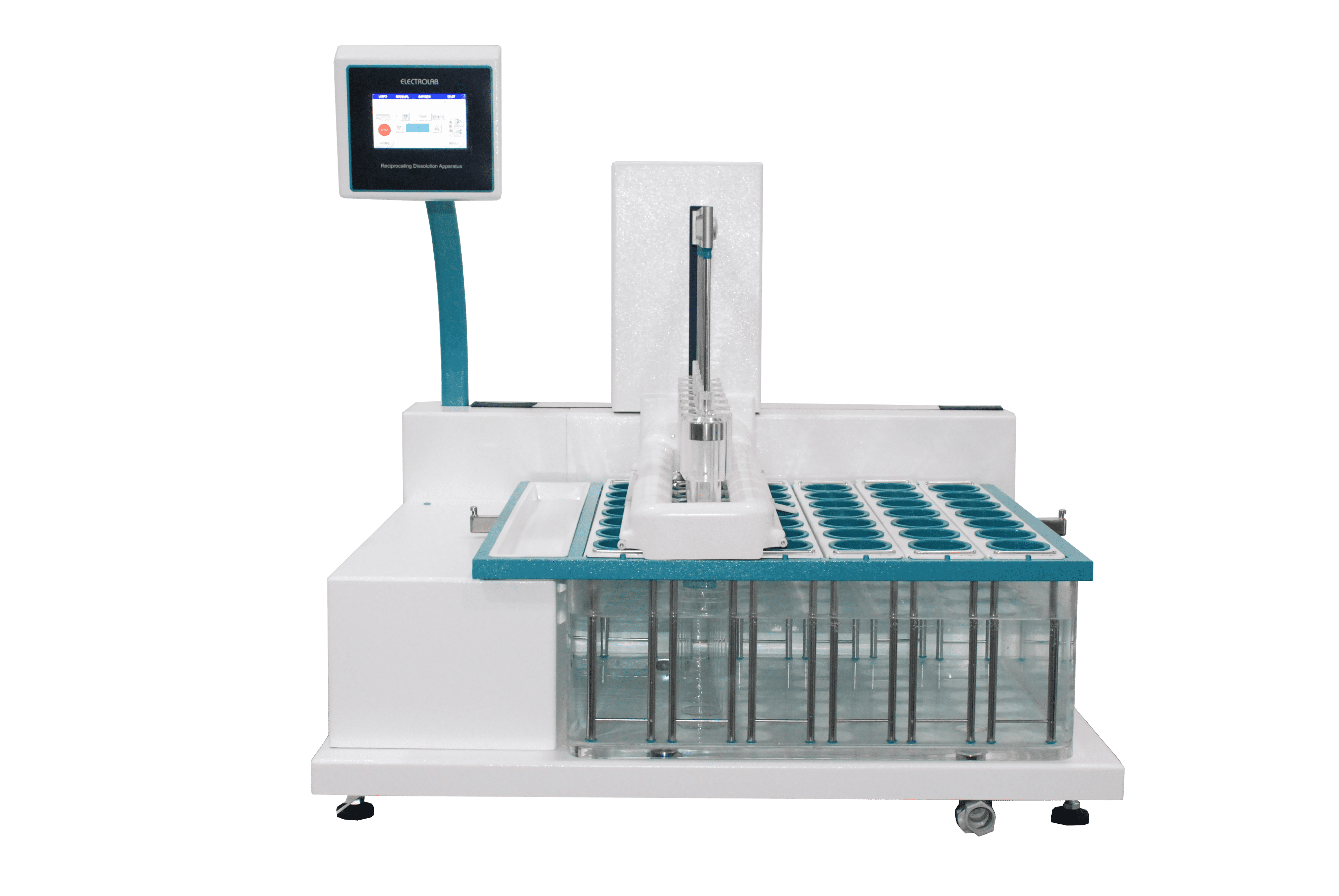 Electrolab's reciprocating dissolution tester is ideal for extended release of products or any dosage form requiring release profiling at multiple pH levels. In order to meet the testing needs for USP 3 and 7 multiple configurations of rows, vessels and vessel volumes are selectable (can be switched by the user). The dissolution tester delivers 20 programmable protocols with 24 sample intervals.